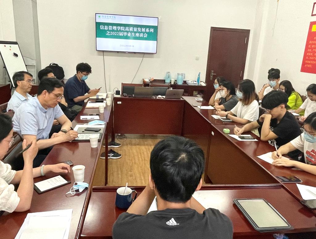 6月1日下午,信息管理学院召开2022届毕业生代表座谈会。学院党委书记郑德俊、院长张兆同、副院长李静出席会议,专兼职辅导员以及20余位本研毕业生代表参加会议,会议由姜晓玥主持召开。