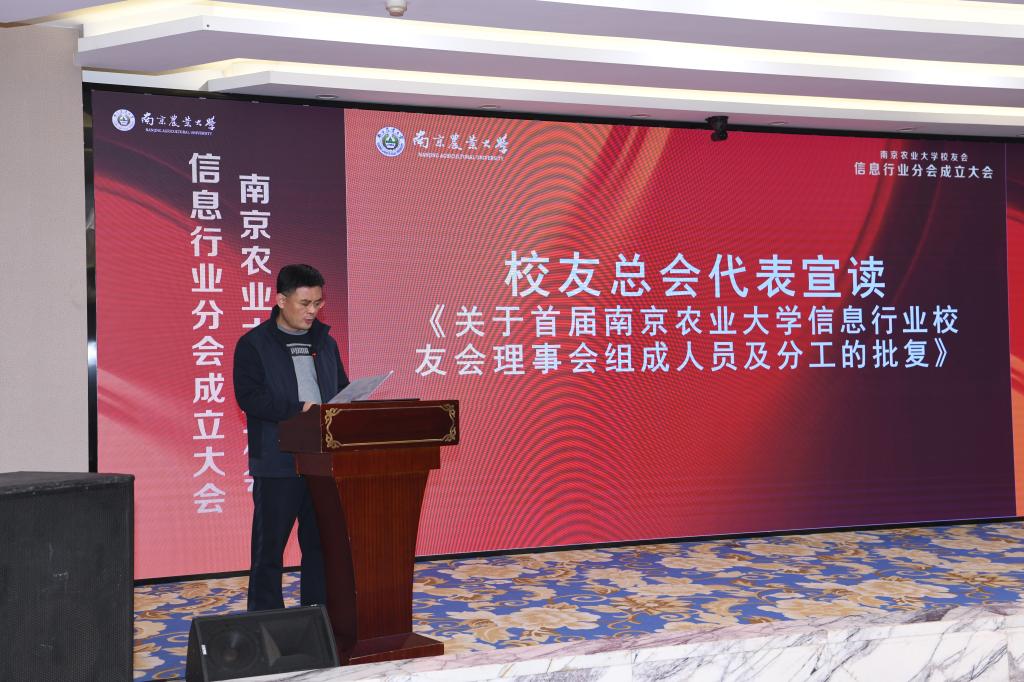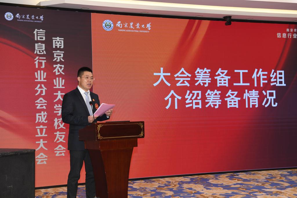 信息管理学院党委副书记王春伟代表筹备工作组介绍校友会信息行业分会的筹备情况。他指出,在黄水清教授的带领下,逐渐组成自我管理、自我组织的信息系校友会。在广大校友和学院领导的共同努力下,十一月二十四日校友总会正式批复成立信息行业校友分会。随后,校友总会陈卫忠代表校友总会宣读《关于首届南京农业大学信息行业校友会理事会组成人员及分工的批复》文件。