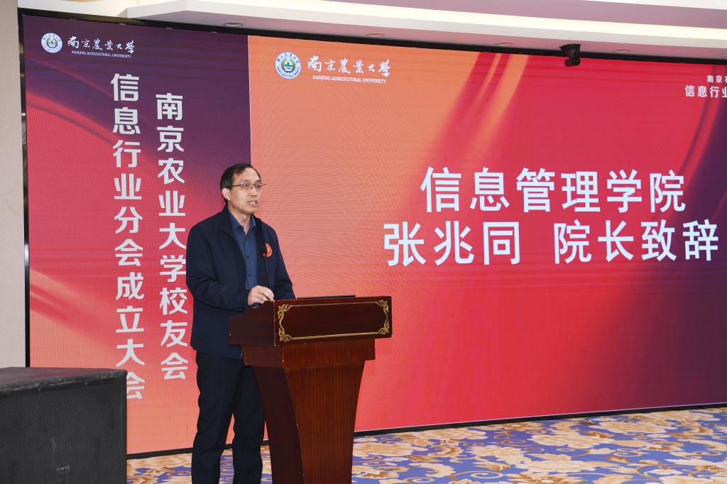 信息管理学院院长张兆同致辞,他代表学院向南京农业大学校友会信息行业分会成立大会表示热烈祝贺。张兆同对信息行业的发展前景提出充分的肯定与殷切的展望,同时充分认可信息行业校友分会成立对于信息行业交流和加强校友之间沟通的重要意义。他提出,信息行业校友会的成立对于学院的人才培养和学院建设同样具有借鉴作用和重要价值,他希望信息管理学院与校友会信息行业分会能全面持续深化交流,优势互补,强强联合,协同创新,共同发展。