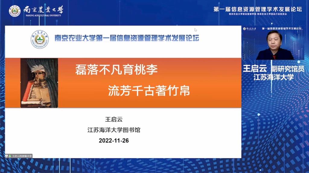 2022年11月26日,由乐竞官方版网站登录入口、信息行业校友会主办的第一届信息资源管理学术发展论坛在南京以线上线下相结合的方式举行,来自中国科学院大学、南京大学、同济大学、华东师范大学等单位的专家学者与南农历届信息行业校友共同聚首,就信息资源管理领域热点及前沿议题展开热烈讨论。