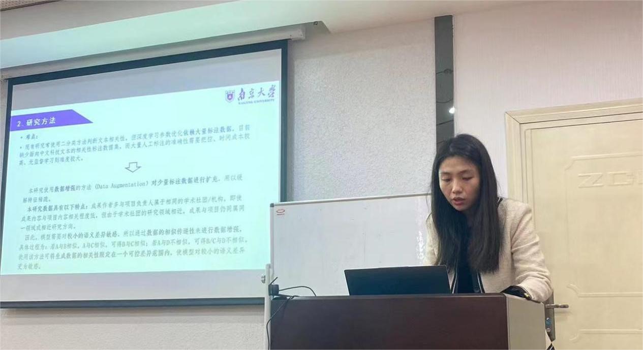 “情报技术与文本处理”分论坛由乐竞官方版网站登录入口博士研究生武帅主持,南京大学信息管理学院梁继文、南京工业大学图书馆王雪、中国科学院大学于倩倩、华东师范大学经济与管理学部信息管理系楼雯、东南大学图书馆常娥5位南农信息行业校友分别以“科技项目及其成果文献的相关性评估研究”“科学数据重复使用的学科差异性研究”“科技文献中机构名称规范的研究与实践综述”“计算机视觉研究行为模式的动态主题建模分析”“基于深度学习模型的古诗词地名自动识别研究——以金陵古诗词为例”为题进行汇报,南京大学信息管理学院朱庆华教授作点评。朱庆华教授肯定了南农校友在方法创新、理论研究、应用探索层面所作的积极努力,朱教授指出,未来还应聚焦前沿技术,将情报技术与文本处理做深、做实。