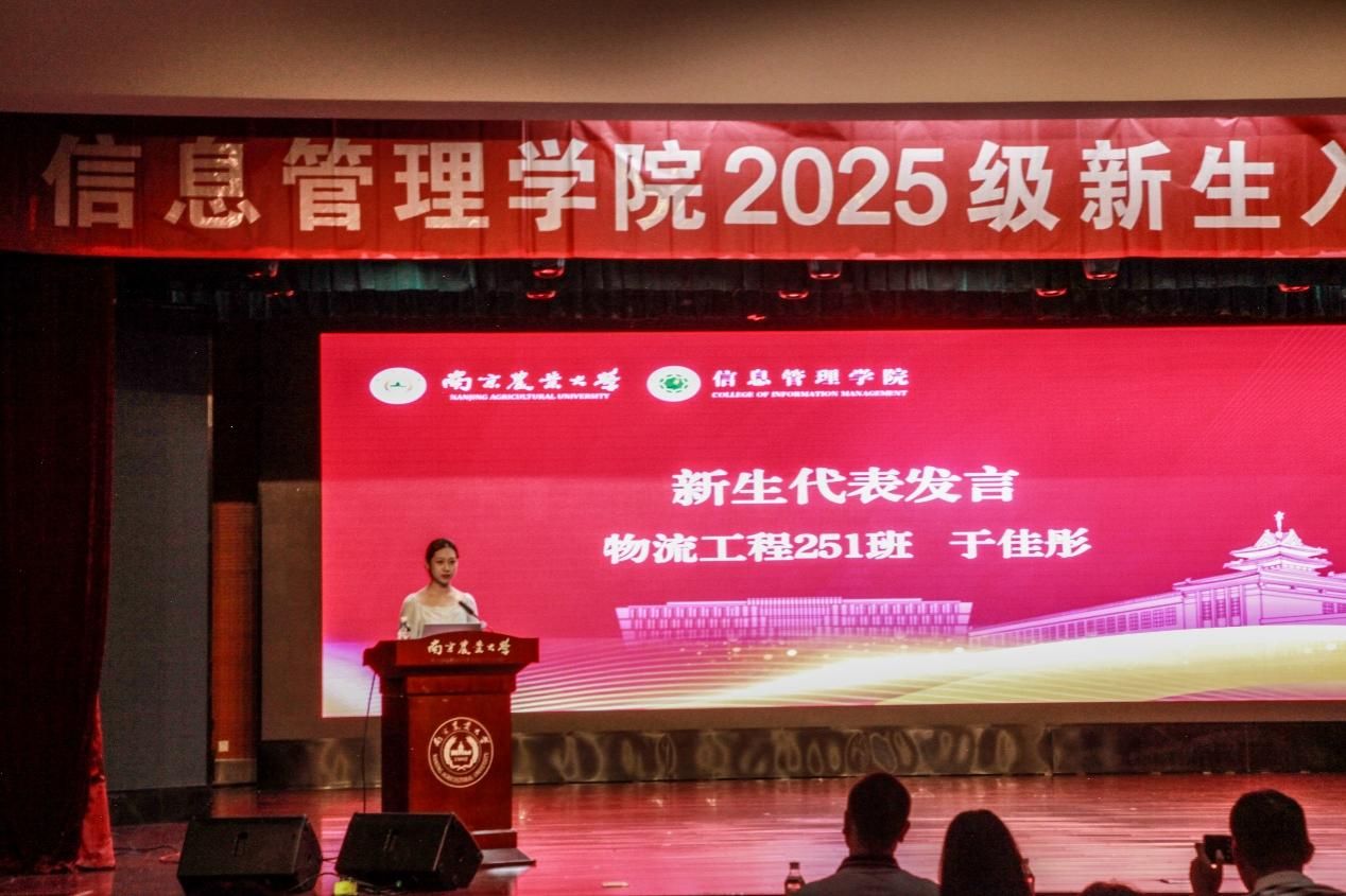 物流工程251班于佳彤作为新生代表发言,表达了对大学生活的憧憬与期待。她号召同学们全力投入学习,主动参与校园活动,全面提升综合素养,不负青春与期待。