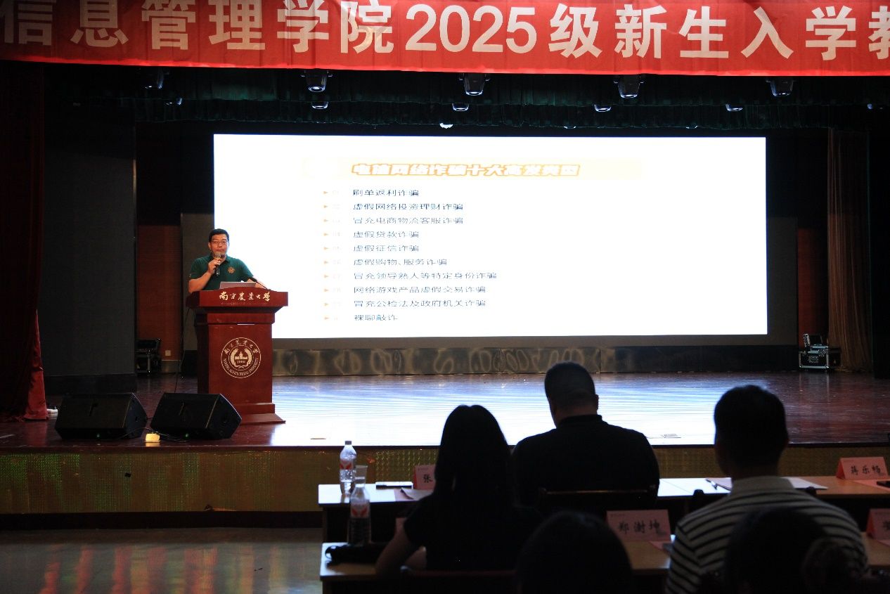 随后,王兆烨老师开展防诈骗宣讲。他通过列举校园常见诈骗案例,如网络兼职诈骗、虚假中奖诈骗等,详细讲解诈骗分子的惯用手段与防范技巧,增强了新生们的安全防范意识,助力他们守护好个人财产安全。