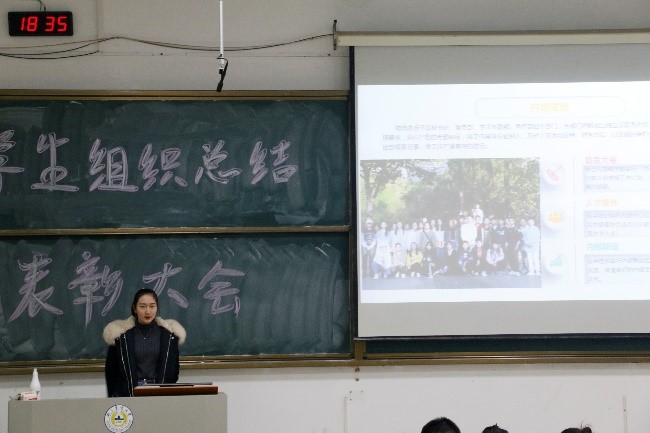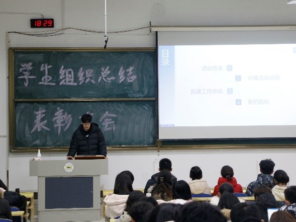 会议的最后进行了表彰颁奖仪式。四位辅导员老师为优秀部长、优秀副部长、优秀学员、金牌编辑、金牌记者、金牌设计颁发了获奖证书。在老师和获奖同学合影留念后,本学期学生组织总结表彰大会在大家热烈的掌声中圆满结束。