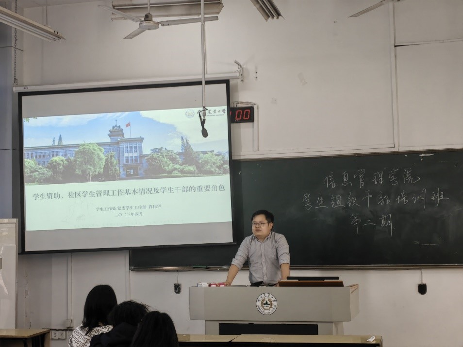 为建设信息管理学院良好学生组织队伍,培养一批优秀的学生干部,促进学生工作的顺利开展、充分发挥学生组织的自主职能,乐竞官方版网站登录入口于月4月12日下午2:00举办了信息管理学院第四届学生组织培训班第二次培训。大会由肖伟华老师主持,主要阐述了学生资助和社区学生管理工作及学生干部的重要角色。