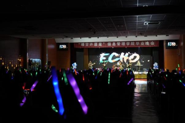 晚会开场时,老师们的一声声寄语拉起了毕业生的回忆,随后echo乐队的激情演出燃爆全场。演出接着便进入了晚会的第一篇章:初-伊始。本篇章节目结束后便进入了抽奖环节,令人惊喜连连。随后由信息管理学院党委副书记王春伟老师和信息管理学院副院长何琳老师分别给朋辈导师们与校园联络大使们颁发聘书。第二篇章:忆-往昔。本篇章包含了话剧,歌曲与舞蹈,丰富的内容让毕业生们在感叹大学生活的美好的同时进一步激发了对未来的向往,新一轮的抽奖更是使全场的情绪进一步升温。第三篇章:再-启航。一声声悠扬的歌曲,伴随着台下荧光棒的舞动成了最美的画卷,一张张灿烂的笑容无疑彰示着晚会的成功。